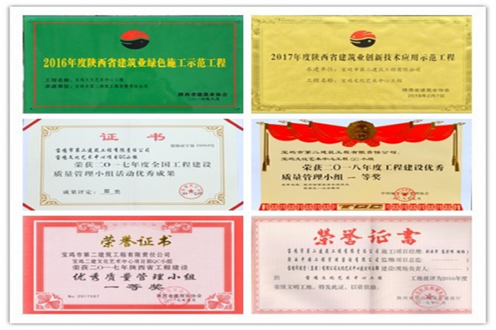 艱難困苦,玉汝于成。通過項目團隊全體員工的共同努力,寶雞文化藝術中心項目先后被評為“2016年度寶雞市優(yōu)質(zhì)樣板主體工程”“2016年度陜西省建筑業(yè)綠色施工示范工程”“2016年度陜西省省級文明工地”“2017年度陜西省建筑業(yè)創(chuàng)新技術應用示范工程”“2017年度陜西省建筑業(yè)優(yōu)質(zhì)結構工程”;項目部先后榮獲全國工程建設質(zhì)量管理小組活動成果獎4項、陜西省工程建設優(yōu)秀QC小組成果獎7項,申報陜西省省級工法1項;項目部先后榮獲公司先進黨支部、先進單位、經(jīng)濟貢獻特別獎單位、“安康杯”安全文化知識競賽活動二等獎,規(guī)劃局系統(tǒng)先進黨支部等榮譽。